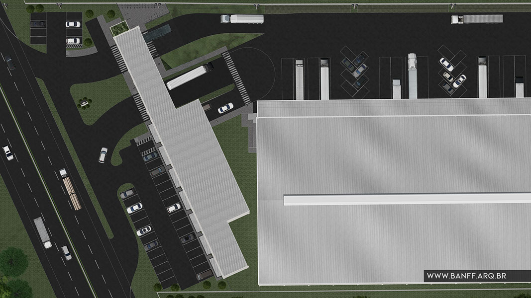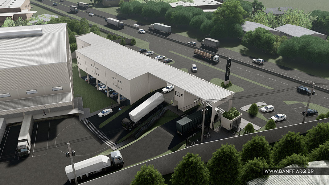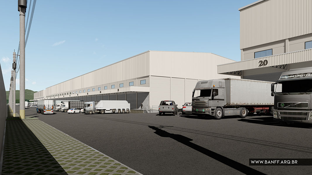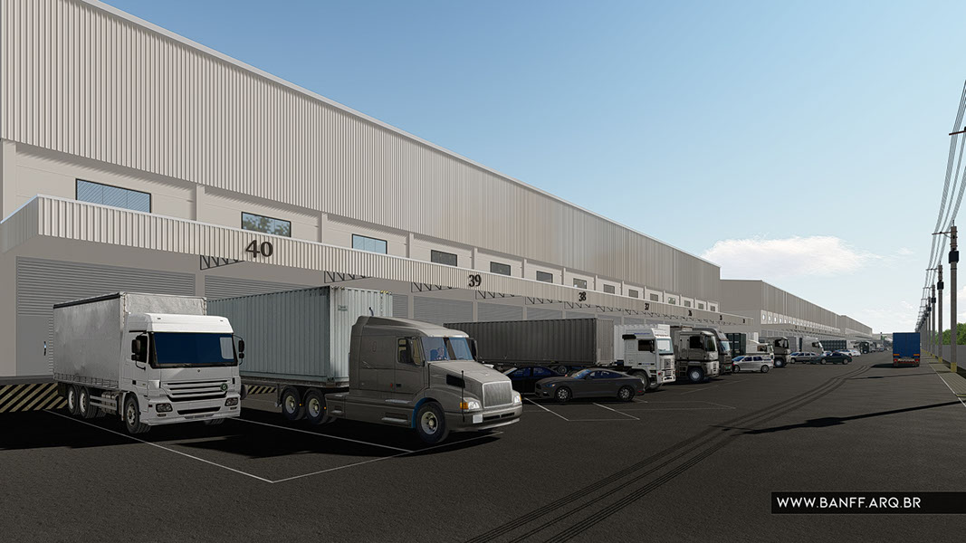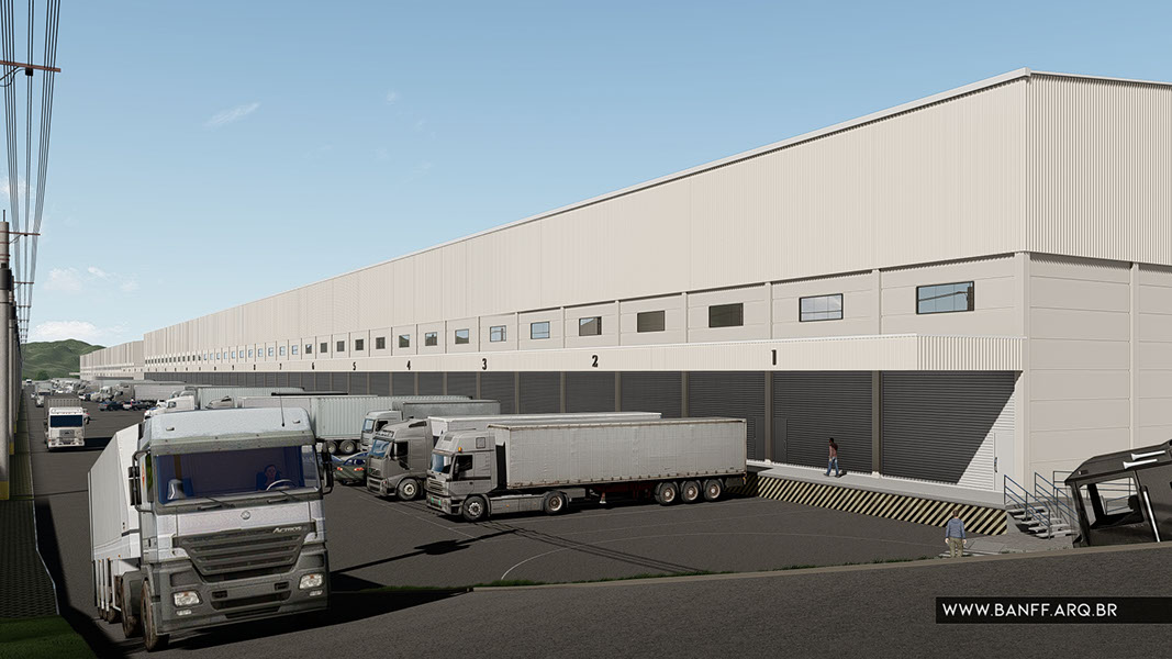 Salas comerciais de frente para a rodovia compõem a fachada para o complexo que possui 3 galpões somando mais de 35.000m², buscando atender empresas de diferentes portes.