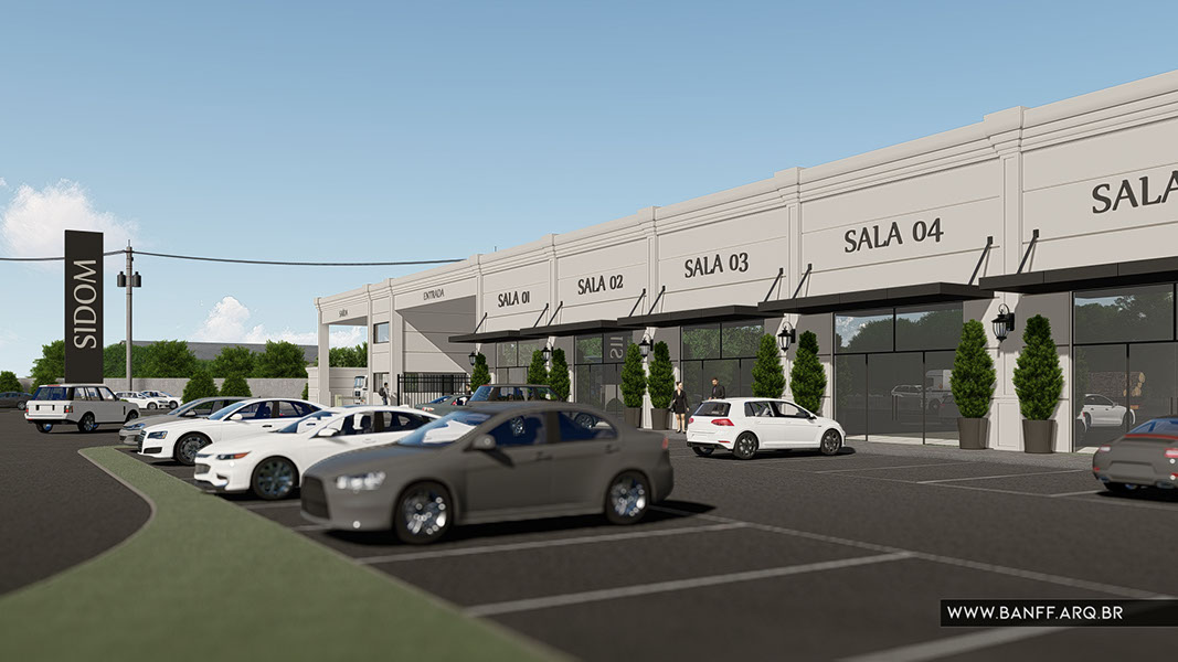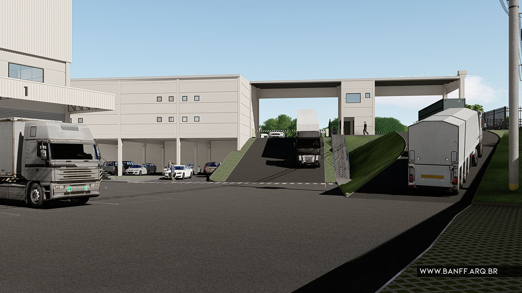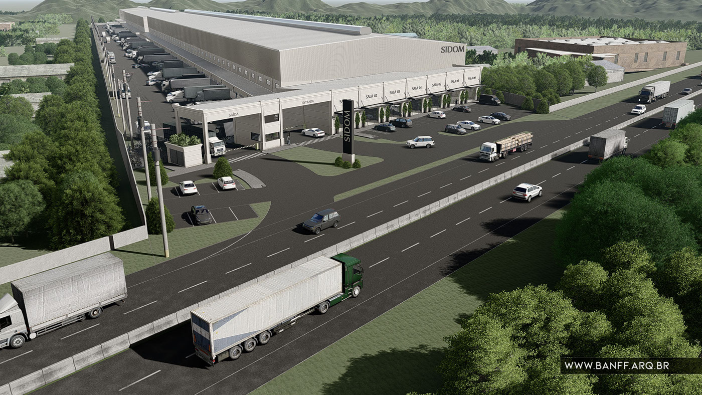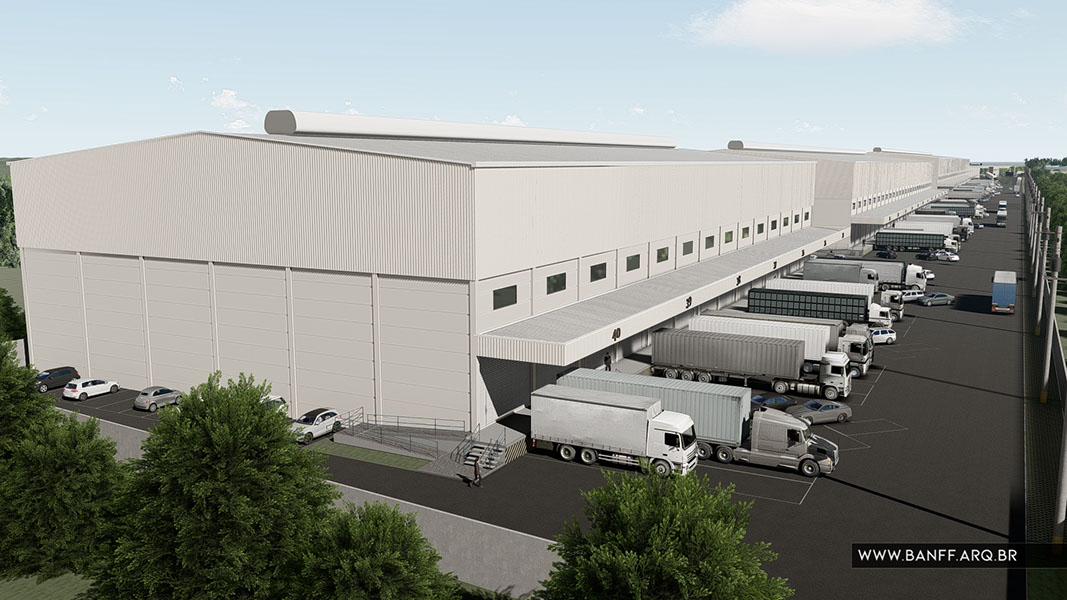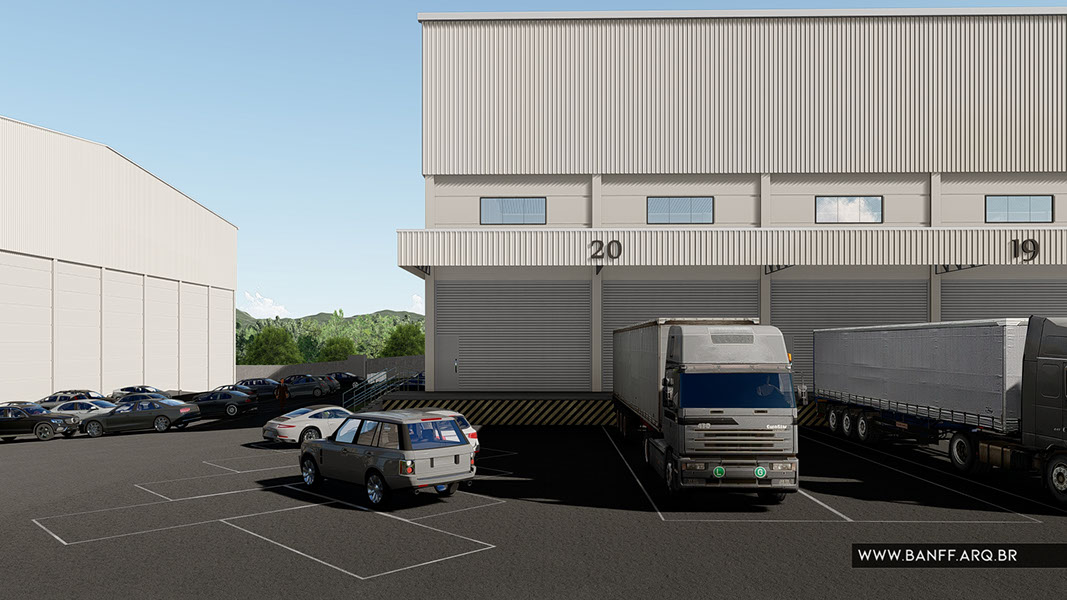 Salas comerciais de frente para a rodovia compõem a fachada para o complexo que possui 3 galpões somando mais de 35.000m², buscando atender empresas de diferentes portes.